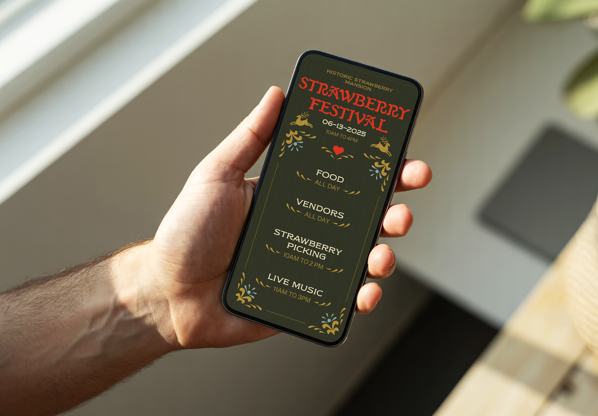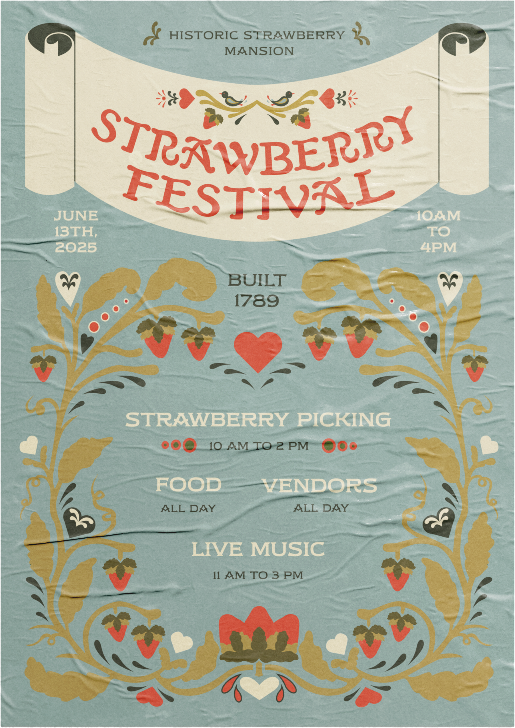 Rebranding of the Historic Strawberry Mansion's Annual Strawberry Festival. Inspiration was drawn from traditional Pennsylvania folk art to remain connected to the state's rich artistic heritage. This project was an exciting opportunity to research and expand my knowledge regarding historical art movements.