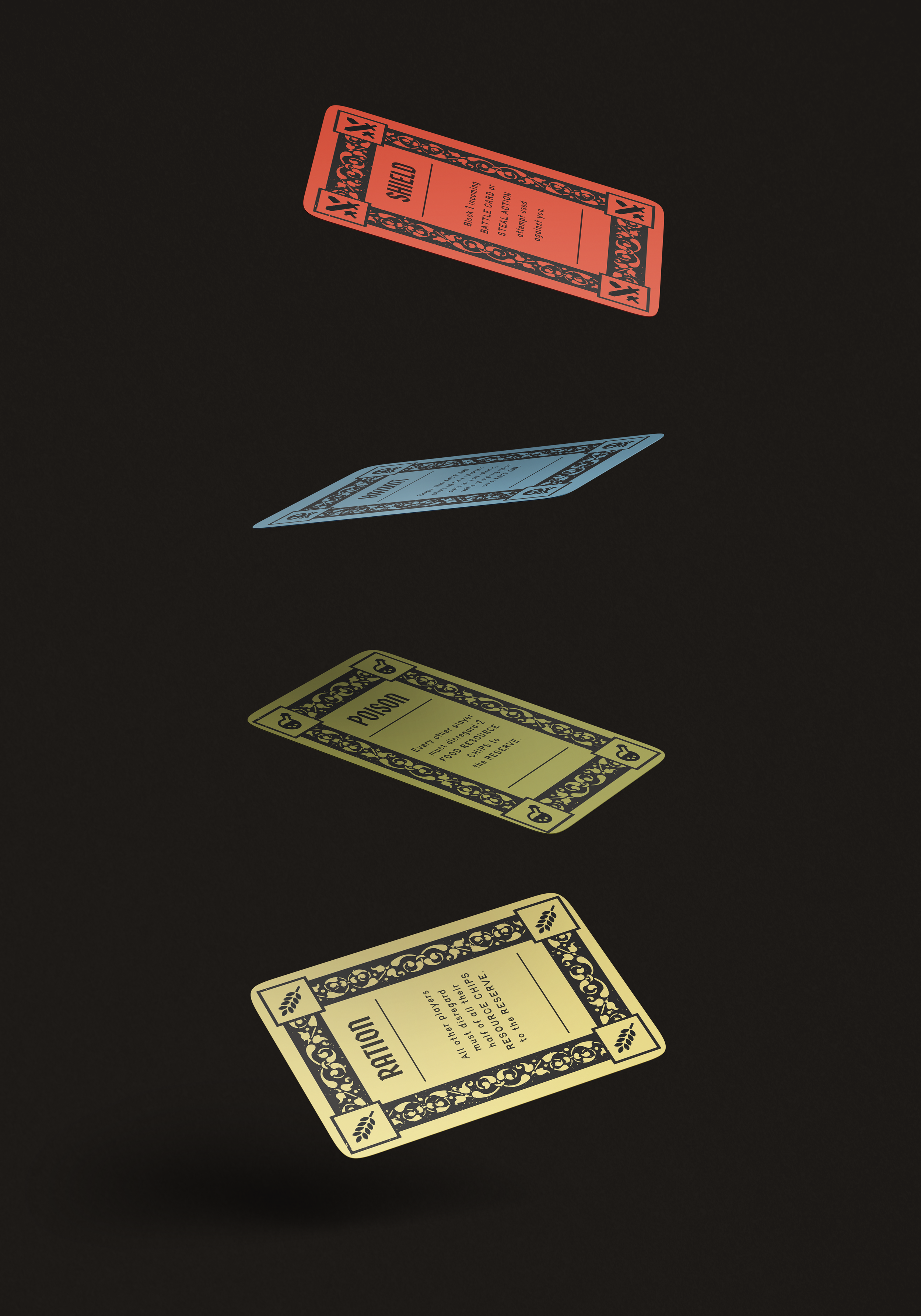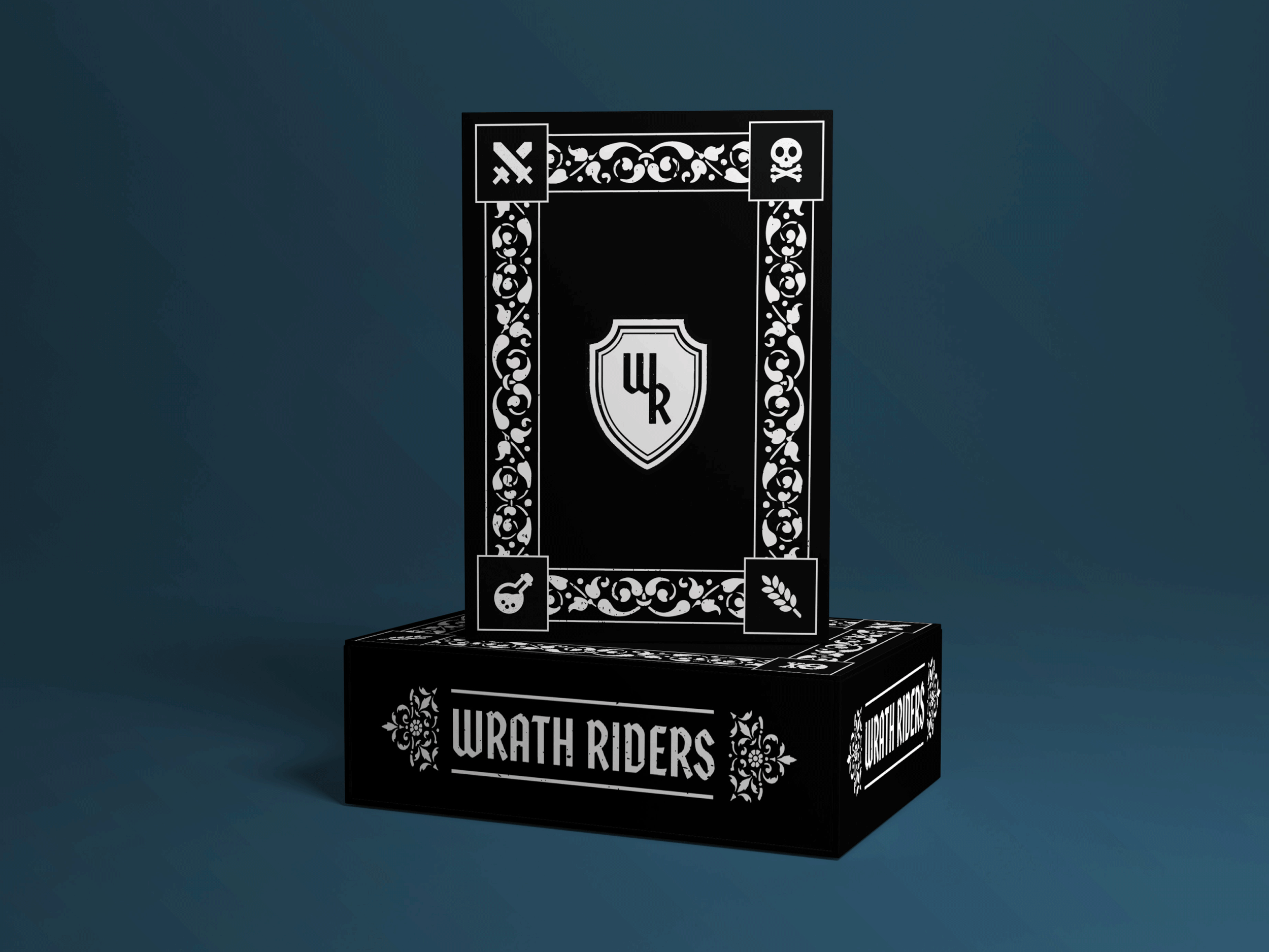 BRANDING, PACKAGING, GAME DEVELOPMENT & DESIGN Game development and packaging design for a tabletop board game inspired by the Four Horsemen of the Apocalypse. The packaging design takes inspiration from the 1980s dark fantasy art style.